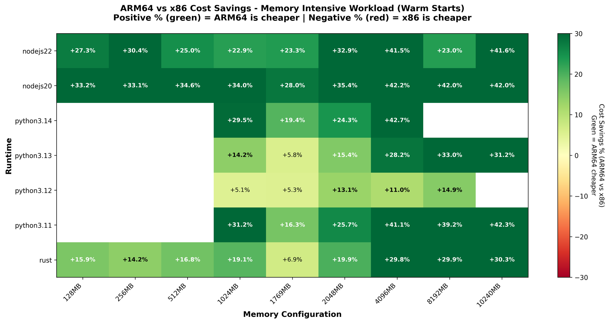 Arm64 delivered significant cost savings for memory-intensive workloads, up to 42%, at higher memory configurations where arm64's performance advantage is most clear. Node.js and Rust showed the most consistent savings (23-42%), while Python's cost efficiency varied due to the performance anomalies noted above.
