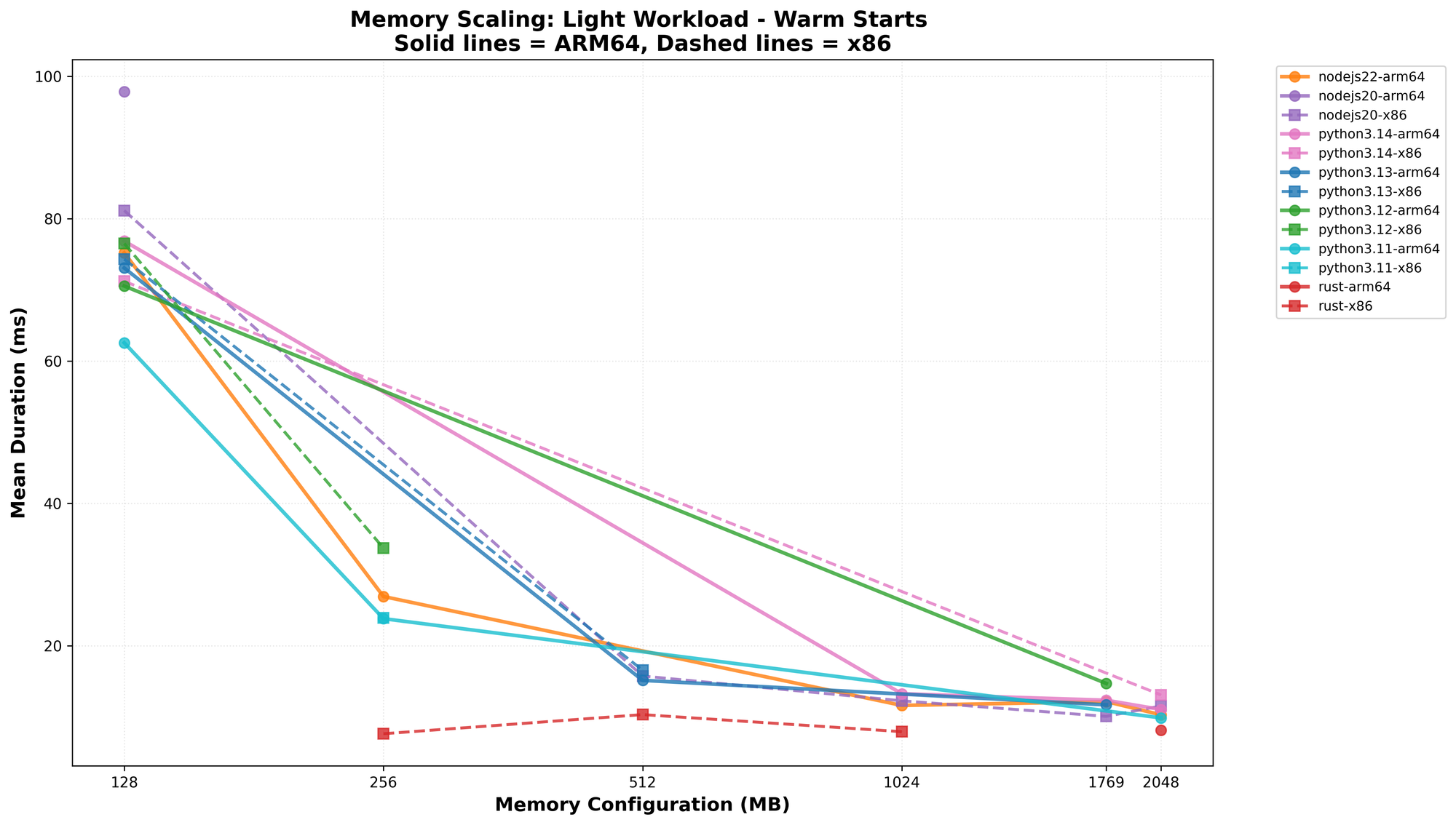 For I/O-bound workloads, the runtime differences largely disappear. When network latency is the bottleneck, whether you're running Rust or Python matters far less. All runtimes completed the light workload in 15-80ms at 512MB and above. The main takeaway for light workloads: optimize for cost, not raw performance.