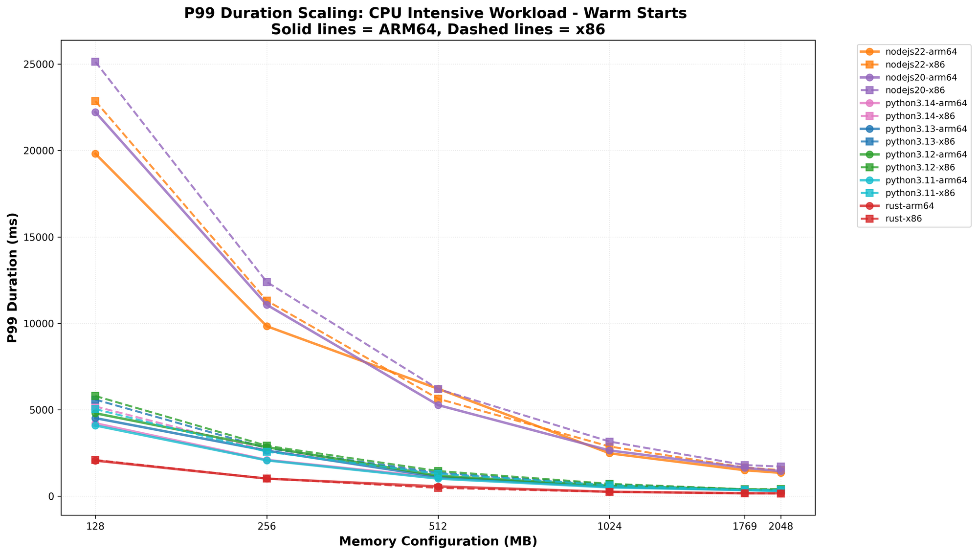 Arm64 delivered 7-38% cost savings for CPU-intensive workloads across all runtimes. Even when x86 is slightly faster, arm64's 20% lower price per GB-second wins on total cost.