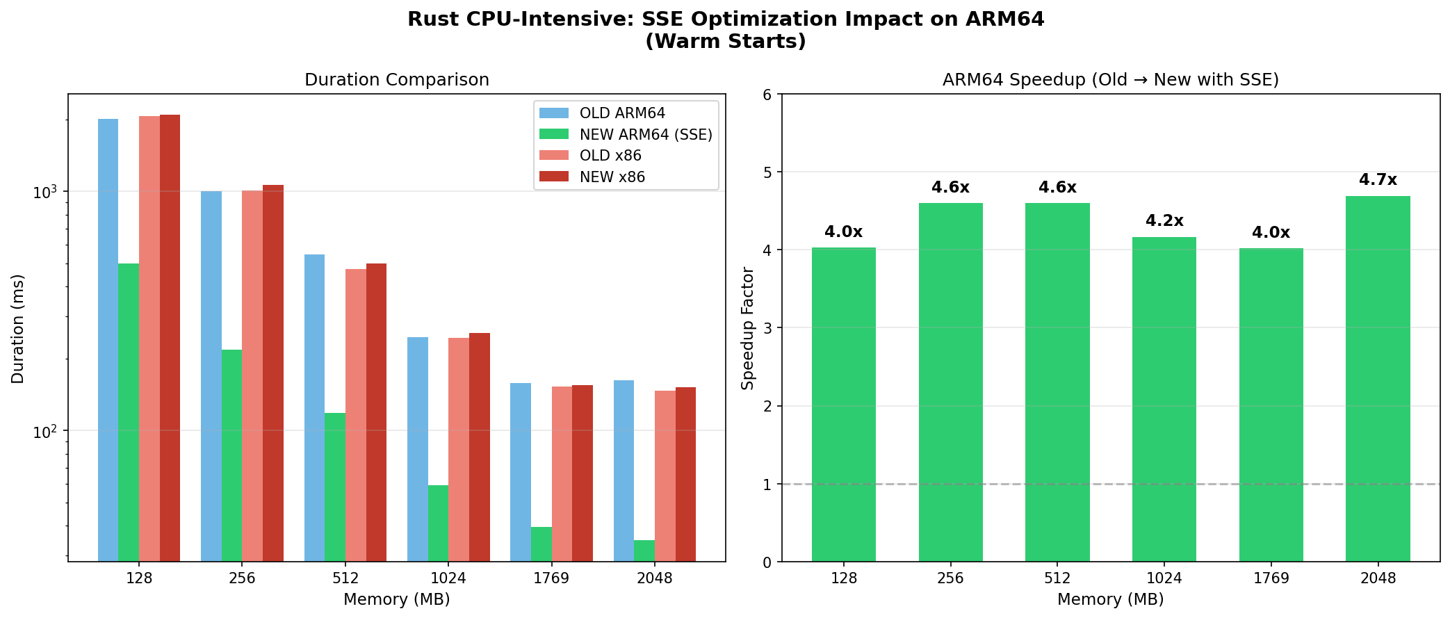 suggested enabling assembly-optimized SHA-256 hashing in the Rust workload. Enabling theasm feature on the sha2 crate resulted in a 4-5x performance improvement for Rust on arm64 in the CPU-intensive workload. Arm64 now completes the SHA-256 benchmark in ~35ms at 2048MB vs ~152ms for x86,
